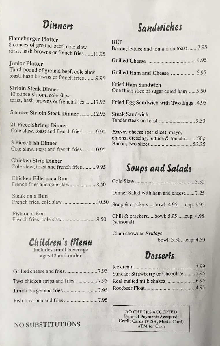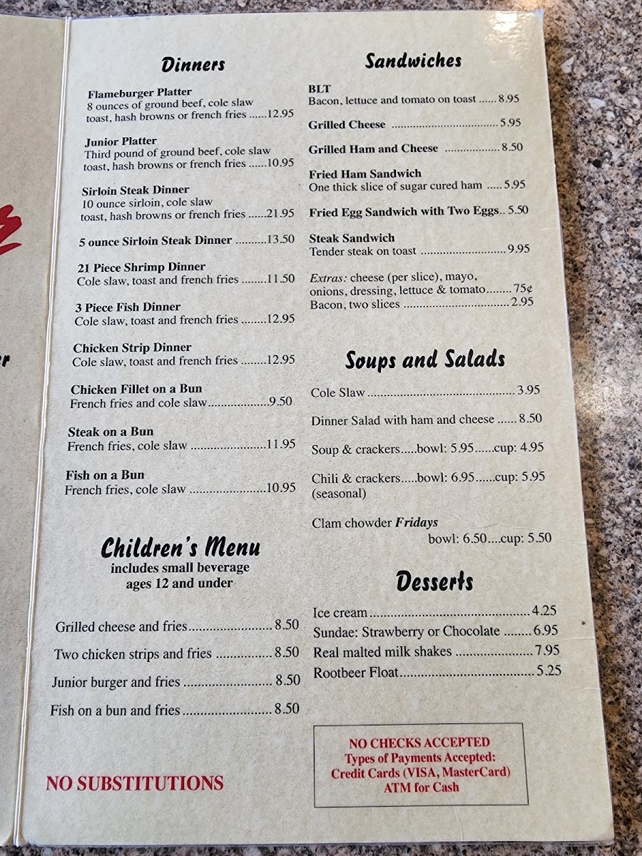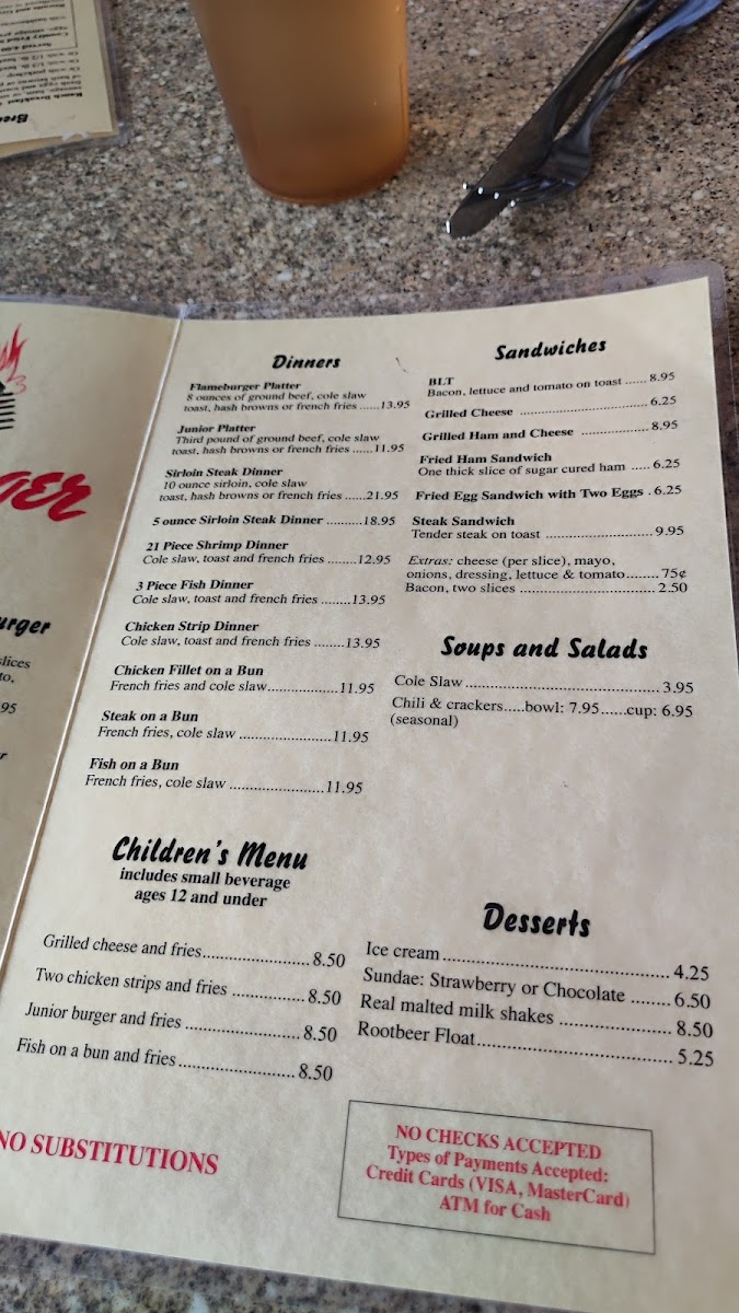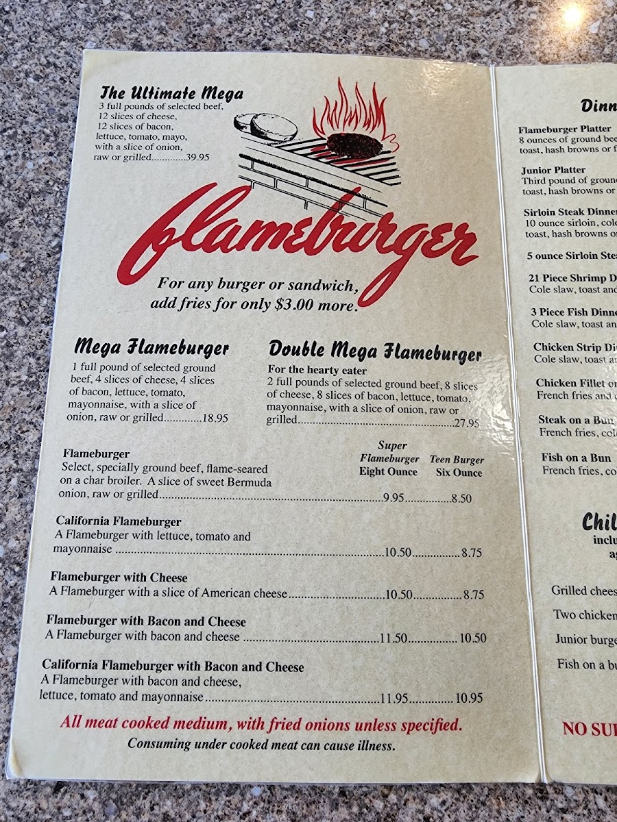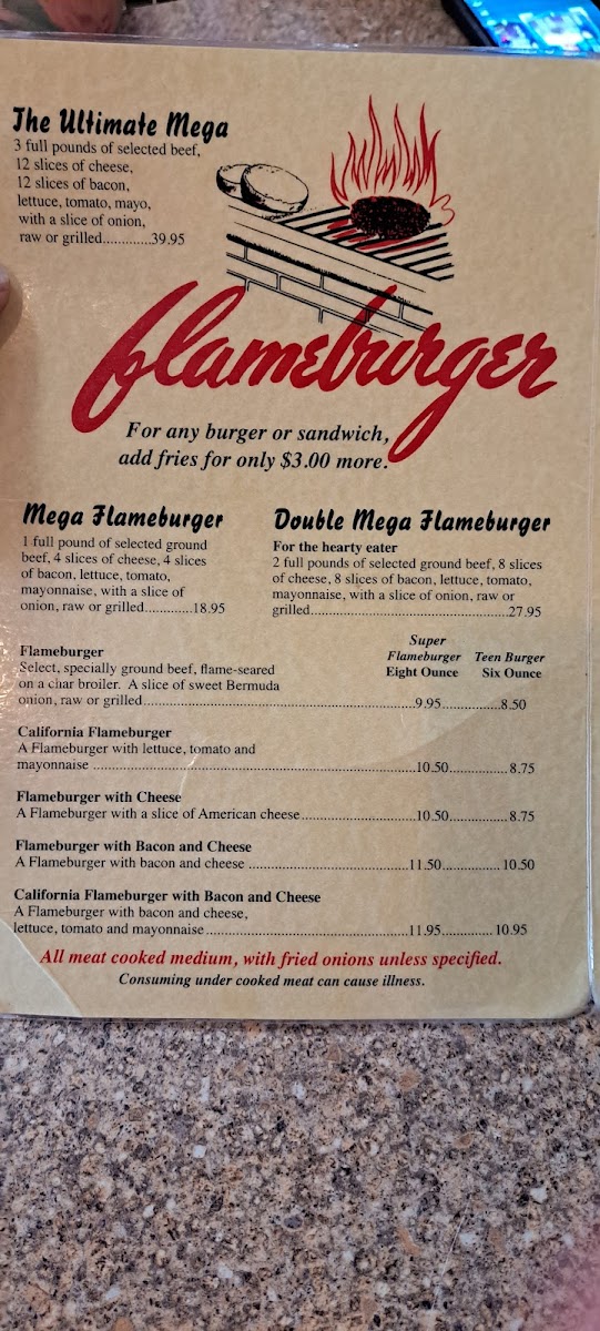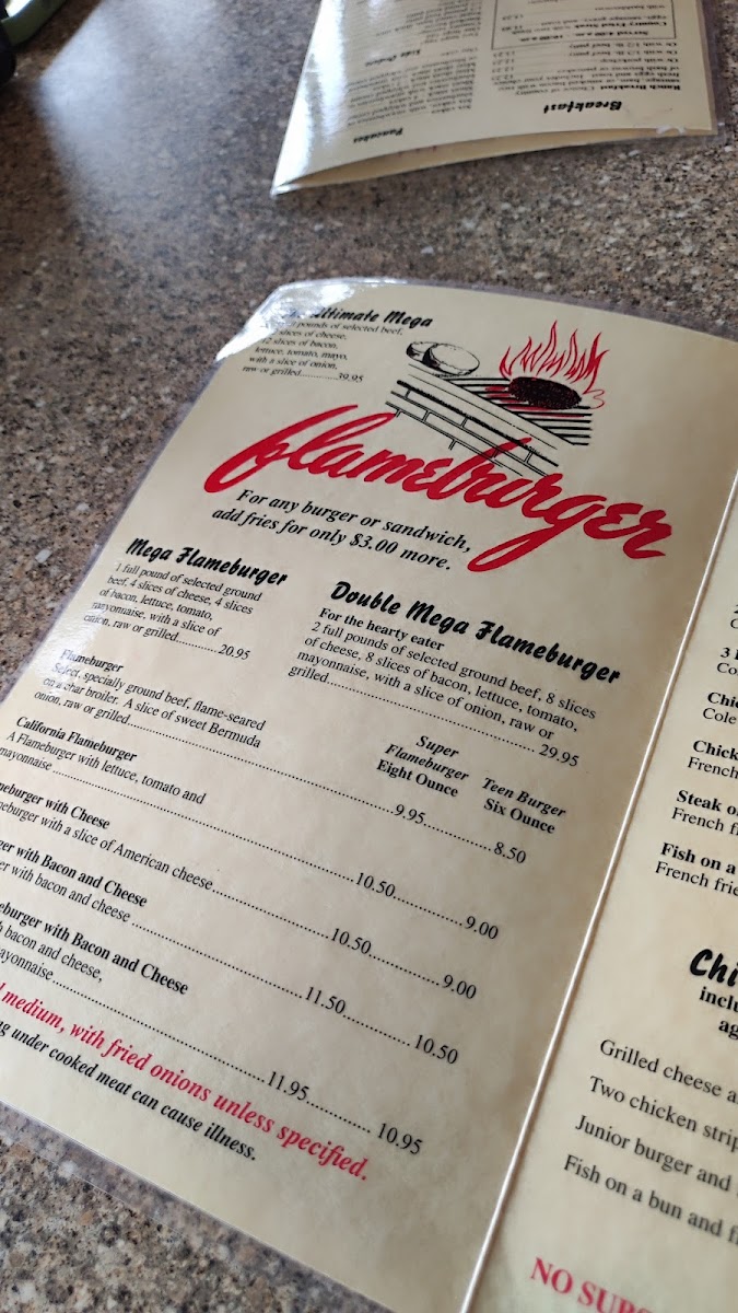 Patrons rave about how the ambiance harkens back to the nostalgia of the '70s, coupled with fast and friendly service. Dishes like the Flameburger Platter and sirloin steak dinners feature generous portions that leave diners satisfied. While some may find the prices slightly elevated, the quality of the food and unique dining experience at Flameburger undoubtedly shine through.